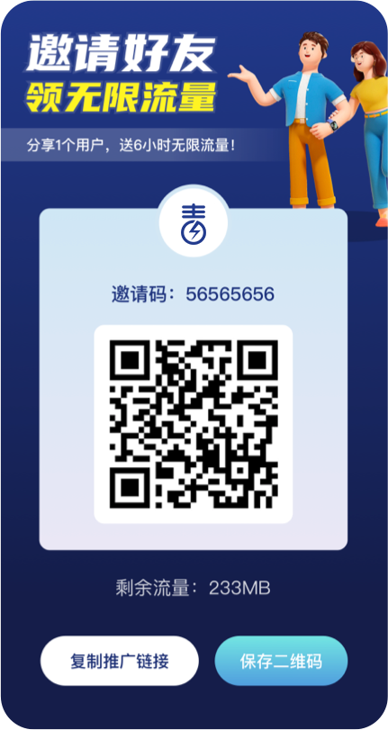 打开毒舌加速器APP,进入首页点击分享按钮进入分享页面;通过下面两个按钮分享成功邀请一人可得6小时无限流量使用, 依次累加两人可得12小时无限流量。