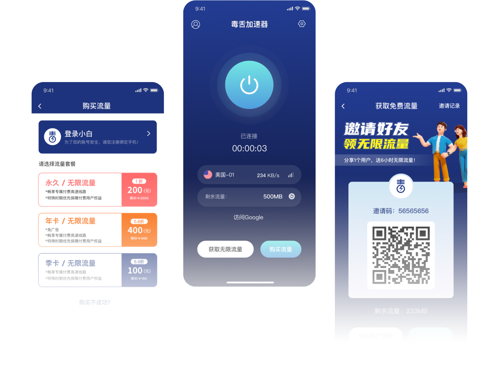 打开毒舌加速器APP,进入首页点击分享按钮进入分享页面;通过下面两个按钮分享成功邀请一人可得6小时无限流量使用, 依次累加两人可得12小时无限流量。